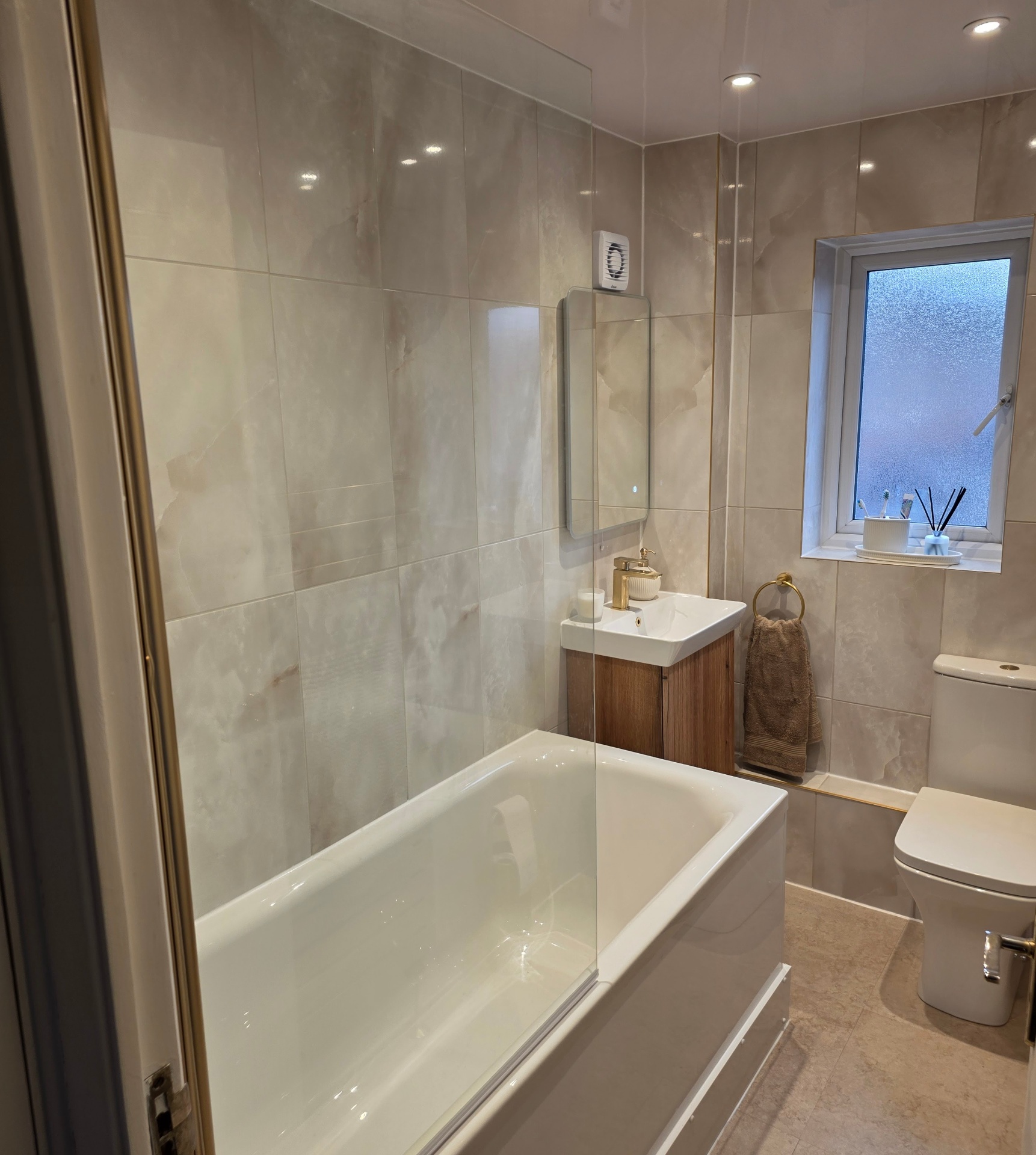 Premium bathroom renovation featuring onyx-effect wall tiling, brushed gold shower fittings, gold heated towel rail, and an oak vanity unit with gold basin mixer. A true luxury finish.